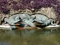 His Alligator Fountain, considered one of the most elaborate decorative motifs in Passeio Público, marked an early attempt to stylize Brazilian fauna in public art.[6] Unlike European fountains, which typically featured gargoyle-style waterspouts, Valentim's fountains had water flowing from the mouths of native animals, an innovation in Brazilian artistic nationalism.[6] Another significant work, the Os Elefants Fountain, included sculpted figures on angular stone pillars, which used a technique not yet widespread in Brazil at the time known as artistic casting. His experimentation with metal casting began a few years earlier with the sculpting of alligators, birds, and coconut trees for Passeio Público.[6]