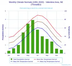 With a humid continental climate (Köppen Dwa), Valentine experiences extremes of heat and cold annually; it is part of USDA Hardiness zone 4b.[14] The normal monthly mean temperature ranges from 24.5 °F (−4.2 °C) in January to 75.7 °F (24.3 °C) in July.[15] In an average year, seven afternoons reach 100 °F (37.8 °C) or higher, 41.3 days reach 90 °F (32.2 °C) or higher, 41.2 afternoons do not climb above freezing, and 17.9 mornings reach 0 °F (−17.8 °C) or lower.[15] The average window for freezing temperatures is September 25 thru May 11,[15] allowing a growing season of 136 days. Extreme temperatures officially range from −39 °F (−39.4 °C) on December 22, 1989, to 114 °F (45.6 °C) on July 2, 1990, with temperatures reaching 110 °F (43.3 °C) as recently as July 21, 2012; the record low daily maximum is −17 °F (−27.2 °C) on January 12, 1916, while the record high daily minimum is 81 °F (27.2 °C) on July 24, 1940, and July 25, 1899.[15]