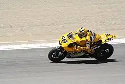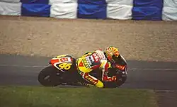 Rossi's first 500cc victory came after a fierce battle with the Suzuki of Kenny Roberts Jr. and the Aprilia of Jeremy McWilliams. On a track that was affected by ever-changing weather conditions and despite only qualifying in seventh position on Saturday, the Italian chose the right tyers and stormed through the field to battle with Roberts Jr. and McWilliams and win his first race in the 500cc class.[40][41] After his victory in Donington Park, Rossi went on to score consecutive podium places in the next three races: two second-place finishes in Germany and the Czech Republic and one third-place finish in Portugal.[42][43][44] He retired from the Valencian Community round after a crash.[45]