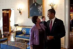 Jarrett was one of three senior advisors to President Obama.[28] She held the retitled position of assistant to the president for intergovernmental affairs and public engagement,[28] managed the White House Office of Public Engagement and Intergovernmental Affairs, and Office of Urban Affairs; she also chaired the White House Council on Women and Girls and the White House Office of Olympic, Paralympic, and Youth Sport.[29] She was part of the U.S. State Visit to the UK in May 2011.[30]