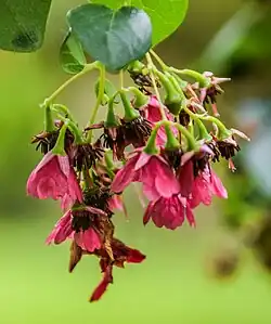 Evergreen shrub or tree up to 18 meters tall; fissured bark. Kidney-shaped stipules on branchlets. Leaves heart-shaped or pear-shaped, sometimes lobed, up to 10 cm long, dark green above, whitish green beneath, with tufts of hairs in the vein axils. Cymose inflorescence with pinkish-red or crimson bell-shaped flowers; these with five sepals and five three-lobed petals, 9–13 mm long; ovary and styles glabrous; 15–60 stamens. Warty fruits, 1 cm wide, often dehiscing on the tree.[3][4]