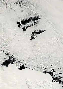 The Balleny Islands (top) and Antarctic coast (bottom) from space, December 2007. Dark patches are ice-free sea surface.