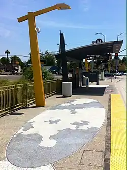 The floor mural and fence art in this station is called "Former Location/ Contemporary Portrait" by Laura London. It depicts of several old-fashioned black and white photos that reflects of the rock-and-roll ages and their trends, including some far-scaled portrait albums from the 1960s from The Rolling Stones. The art is also at the setting where Valley College used to exist during the earlier days, now California State University Northridge. The floor mural simply depicts of the black-and-white old age symbolism.[6]