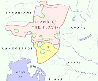 At the latest after the weakening of Pannonian Avars in 626 (if not already in 623), Slavs in the Eastern Alps joined the Slavic tribal association of the Duke Samo.[4][5] In 630, the Franks were also involved with the Lombards, which were bordered in Carantania as the territory in Samo's tribal union.[4]