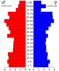 There were 3,108 households, out of which 25.4% had children under the age of 18 living with them, 55.4% were married couples living together, 7.0% had a female householder with no husband present, and 33.8% were non-families. 27.7% of all households were made up of individuals, and 33.6% had someone living alone who was 65 years of age or older. The average household size was 2.40 and the average family size was 2.97.