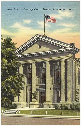 - ^ Mary Ann Lee and Joe Mobley (n.d.). "North Carolina County Courthouses TR: Vance County Courthouse" (PDF). National Register of Historic Places - Nomination and Inventory. North Carolina State Historic Preservation Office. Retrieved August 1, 2014.