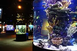 This gallery is home to jellies, fish, and other animals. The 4D Theatre and the children's play area known as "Clownfish Cove" are here, along with multiple classrooms for school groups, including the wet lab education room, which contains both conventional teaching methods such as computers, tables, and chairs, along with live animals and various artifacts.