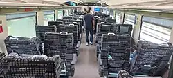 The train has two classes of accommodation with the AC Executive Class being the premium class and the AC chair being the other. The executive class coach can seat 52 passengers and is equipped with rotating seats in a 2x2 configuration.[42] The chair car coaches can seat 78 passengers per coach (44 in first and last coaches) and are equipped with retractable seats in 2x3 configuration.[43] The coaches are fully air conditioned and equipped with electric outlets, reading lights, CCTV cameras, automatic doors, bio-vacuum toilets, Sensor-based water taps and Passenger information system.[44] The coaches have wider windows with roller blinds and overhead racks for luggage.[45] The service offers onboard catering with both vegetarian and non-vegetarian meal options included in the fare as standard.[46][47]