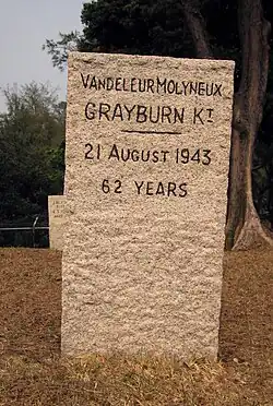 For the first half of his sentence he remained in good health. Beginning from 16 August 1943 he complained about a slight fever and a loss of appetite. His condition deteriorated and was sent to the Prison hospital on 18 August. Khader Bux, an Indian warder, acted as a medical officer, applied to the Japanese authorities four times for a doctor but none was sent. Dr. Harry Talbot, who was also sent to the same prison, diagnosed a high fever and was slightly delirious on 20 August. Although Bux managed to get some sulphonamide tablets smuggled in for the patient, Grayburn was already comatose on 21 August.[34] He died at about 7.30 p.m. on Saturday, 21 August at the age of 62. He was buried at today's Stanley Military Cemetery. Streatfield wrote on Grayburn's death: