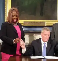 Vanessa L. Gibson (born March 19, 1979) is an American politician who has served as the Borough President of The Bronx since 2022. She served as a member of the New York City Council, representing the 16th district from 2014 to 2021.[1] A Democrat, she was elected Bronx Borough President in November 2021 to a four-year term beginning January 2022, running on a platform focused on recovery from COVID-19 impact, food insecurity and housing instability.[2][3] She is the first female and first African American Bronx Borough President.[4][5]
