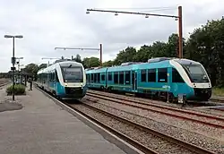 Varde station is a railway junction, which is located on the Esbjerg–Struer railway line from Esbjerg to Struer, and is the terminus of the Varde–Nørre Nebel railway line from Varde to Nørre Nebel. The station opened in 1874.[3] It offers regional rail services to Aarhus, Esbjerg, Herning and Skjern, and local train services to Oksbøl and Nørre Nebel, operated by GoCollective.[5]