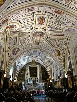 The central nave vault is divided into three quadrants, showing personifications of Faith, Religion and Eternity[3][4] It is accompanied along the walls by 17th century furniture decorated with a cycle of precious wooden inlays by Fra Giovanni da Verona dating to 1506 (the third cycle after those of Santa Maria in Organo in Verona and the Territorial Abbey of Monte Oliveto Maggiore near Asciano) with views of the city and scenes of life in the Olivetan order. Between the inlays are niches with wooden statues showing saints relating to the Olivetans. Behind the altar is a painting of Carlo Borromeo by Girolamo d'Arena, which had hung in the original church of Sant'Anna dei Lombardi (which had also been dedicated to St Carlo Borromeo) but was moved to its present location after that church was destroyed in the 1805 earthquake. Either side are two paintings of Michael the Archangel and the Virgin Mary.