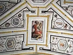 He almost refused it due to the space's Gothic architecture, which he felt might be too dark to show off his style to best effect. He decided to take it, however, and plastered the vaults, brightening the space and giving him extra space to paint. Some of the figures were painted from Vasari's drawings by Raffaellino del Colle,[3] whilst Stefano Veltroni and others assisted with the purely decorative areas. Whilst painting the frescoes Vasari also produced two triptychs, one for the room's counter-facade and one for its back wall, showing The Manna from Heaven and The Feast in the House of Simon, now in the Museo nazionale di Capodimonte and Museo Diocesano di Napoli.