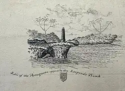 The pillar is depicted on a chart of the Leopard Bank (south of Malindi) drawn in November 1823.[14] This was drawn by a British Admiralty survey team led by Captain William Fitzwilliam Owen. Owen described the promontory on which the pillar stood as 'perfectly flat at the top, and elevated above the sea about twelve feet. If ever there existed an inscription upon this pillar it is totally obliterated, as not a line can now be traced; but the marble cross on its summit exhibits the arms of Portugal in full preservation.'[15] The padrão depicted on Owen's chart was similar in appearance to the modern pillar.[16] This suggests that the original padrão had been strengthened at some earlier time.