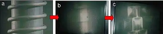 For the basic process only a thin-walled cylinder and supporting elements (supporting rings) which are positioned on the inside surface of the cylinder are needed. When the cylinder is put under an exterior pressure, the material between the supporting rings is pushed inwards. After reaching a critical but still considerably small exterior pressure (instability point), rectangular vault structures are formed spontaneously. This effect is called in the jargon as „buckling“. The circumferential, straight folds arise by the underlying supporting elements, while the axial folds develop all by themselves (self-organization) in a staggered way without an underlying tool.