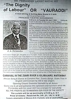 - ^ a b Fernandes, André Rafael (2010). When the Curtains Rise--: Understanding Goa's Vibrant Konkani Theatre. Tiatr Academy of Goa. pp. 49–50, 66–67, 87–93. ISBN 978-93-80739-01-4.