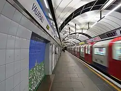 The current deep tube London Underground station is on the Victoria line, which was the first major post-war underground project in Central London. The line was given approval to be extended from Victoria underneath the Thames to Vauxhall (and onwards to Brixton) in March 1966. To construct the escalator shaft, the ground beneath it was frozen with brine.[29] The station platforms were designed by Design Research Unit and decorated with a motif from the 19th-century Vauxhall Gardens, designed by George Smith.[30][31] At the same time, Vauxhall Cross road junction was rebuilt in order to accommodate the new Underground station.[32] The Underground station was opened on 23 July 1971 by Princess Alexandra, as part of the extension of the Victoria line to Brixton.[18][30]