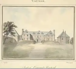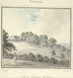 In 1776 Thomas Pennant stayed with his friend Arthur Blayney at nearby Gregynog while making a tour through Montgomeryshire. When this Tour was included in the second edition of ‘‘Tour in Wales’‘ which was published in 1783, he only included a short description of Vaynor. He intended to revise the Montgomeryshire tour, and, as it was un-illustrated, he commissioned the artist in John Ingleby in 1794–6 to produce a series of watercolours of Montgomeryshire houses and churches. These watercolours are now in the National Library of Wales and included two watercolours of Vaynor. In one of these, Ingleby shows himself on horseback sketching Vaynor. Ingleby's watercolour shows the S W aspect of the house which now looks onto a rectangular court yard at the opposite end of which is a long stable block. The two forward wings of the house remain but the buildings to each side have been removed.