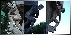 There are differing interpretations regarding the three sculpted wooden figures. Some scholars propose that they symbolize slavery, while others suggest they are inspired by the Atlas motif, depicting a figure bearing the weight of the world. Dr. Antonio J. Montalvan II, citing the genealogy of the Vega Clan, asserts that the sculptures represent the three sons of Ignacio Juan Vega: Santos, who was married to Valentina Roa and Juana Valmores; Pedro, who was married to Benita Salvacion; and Gregorio.