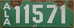 The state first issued annual license plates on October 1, 1911, with plate #1 being issued to the Leak Funeral Home in Montgomery.[1] Until 1980, the license year was October 1 to September 30. Porcelain plates were originally used, before the state switched to embossed metal plates in 1915. The 1916–17 plate was the first to feature the year of expiration, while the 1921–22 plate was the first to use a horsepower class system, with each class denoted by a letter.[3] Kilby Prison near Montgomery took charge of all plate manufacture in 1928.[1]