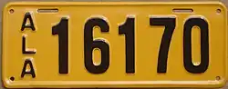 1915–16 | Embossed black serial on yellow plate; vertical "ALA" at left | none | 12345 | 1 to 10000; 15001 to approximately 24100 |