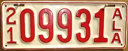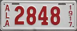 1916–17 | Embossed red serial on white plate; vertical "ALA" and "1917" at left and right respectively | none | 12345 | 1 to 25000; 35001 to approximately 36600 |