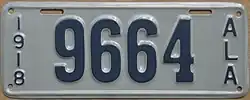1917–18 | Embossed blue serial on gray plate; vertical "1918" and "ALA" at left and right respectively | none | 12345 | 1 to approximately 30200 | |