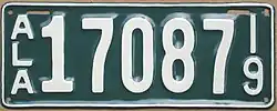 1918–19 | Embossed white serial on dark green plate with border line; vertical "ALA" and "19" at left and right respectively | none | 12345 | 00001 to approximately 49500 | |