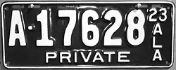1922–23 | Embossed white serial on dark blue plate with border line; "23" and vertical "ALA" at right; "PRIVATE" centered at bottom | none | A-12345 | Coded by horsepower class (A) | |