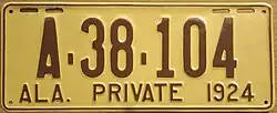 1923–24 | Embossed brown serial on cream plate with border line; "ALA. PRIVATE 1924" at bottom | none | A-123-456 | Coded by horsepower class (A) | |