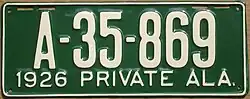 1925–26 | Embossed white serial on green plate with border line; "1926 PRIVATE ALA." at bottom | none | A-123-456 | Coded by horsepower class (A) | |
