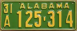 1930–31 | Embossed yellow serial on green plate with border line; "ALABAMA" at top, offset to right; "31" at top left | none | A123-456 | Coded by horsepower class (A) | |