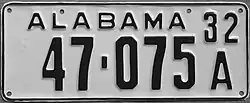 1931–32 | Embossed black serial on white plate with border line; "ALABAMA" at top, offset to left; "32" at top right | none | 123-456A | Coded by horsepower class (A) | |
