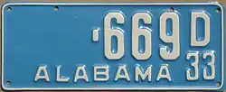 1932–33 | Embossed white serial on light blue plate with border line; "ALABAMA" at bottom, offset to left; "33" at bottom right | none | 123-456A | Coded by horsepower class (A) | |