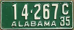 1934–35 | Embossed white serial on green plate with border line; "ALABAMA" at bottom, offset to left; "35" at bottom right | none | 123-456A | Coded by weight class (A) | |