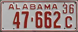 1935–36 | Embossed red serial on white plate with border line; "ALABAMA" at top, offset to left; "36" at top right | none | 123-456A | Coded by weight class (A) | |