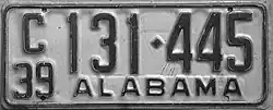 1938–39 | Embossed black serial on silver plate with border line; "ALABAMA" at bottom, offset to right; "39" at bottom left | none | A123-456 | Coded by weight class (A) | |
