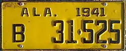 1940–41 | Embossed black serial on yellow plate with border line; "ALA. 1941" centered at top | none | A 123-456 | Coded by weight class (A) | |