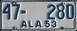 1952–53 | Embossed blue serial on white plate with border line; "ALA. 53" centered at bottom | none | 1-123·456 10-12·345 |