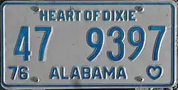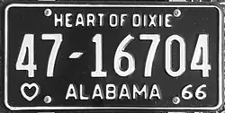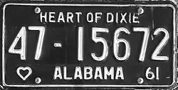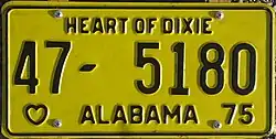 A 1951 law added a heart shape and the phrase "Heart of Dixie" to the state's license plates (beginning with the 1954–55 plate), adopting a slogan created by the Alabama Chamber of Commerce. The heart motif and slogan remain in use on all standard-issue plates today.[1]