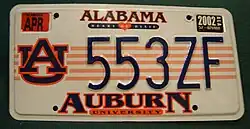 Coded by county of issuance (1 or 10) | Issued in the colors of Auburn University. |