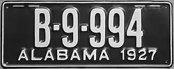 1926–27 | Embossed white serial on black plate with border line; "ALABAMA 1927" at bottom | none | A-123-456 | Coded by horsepower class (A) | First use of the full state name. |