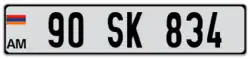 Vehicle registration plates of Armenia have black characters on a rectangular white background. They are composed of two or three numbers, two letters (smaller than the digits) in the middle, and two (or three) other numbers. At the left side is located the international code "AM" with an oval car plaque and, sometimes, the national flag. Starting from 6 August 2014 a new design of license plates was implemented.[1] The license plates have a national flag on the left side, a security hologram and a machinery readable Data Matrix Code.