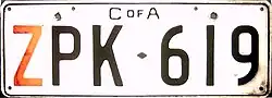 These plates were on a black on white background, usually marked with "C of A" at the top of the plate – an abbreviation of Commonwealth of Australia and the leading Z being red to further distinguish it from other state plates.