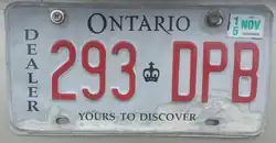 In Ontario, motor vehicle dealers licensed under the Motor Vehicle Dealers Act use a single portable plate with the word "DEALER" on the left side and red alpha-numeric characters on a white background. It is for exclusive use by motor vehicle dealers only on motor vehicles owned as part of the dealer's inventory of vehicles for sale. It may also be used for private use vehicles that are owned as part of the dealer's inventory of vehicles for sale. The dealer, his/her family or the employee of the dealership or the employee's family may also use such a vehicle for private use.