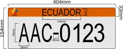 The plates are 154 mm high and 404 mm wide and are reflective in order to improve their visibility. The unique letter-number combination consists of three letters followed by three or four digits ranging from 000 to 9999. Formats in use are ABC-123 (old format) and ABC-1234 (new format). The word "Ecuador" appears in uppercase letters at the top of the plate. The plates are using FE-Schrift typeface for alphanumeric and Calibri typeface for ECUADOR text since 2022.