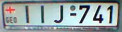 Vehicle registration plates of Georgia are composed of an embossed serial of two letters, a hyphen, three numbers, a hyphen, and two letters (e.g. AB-115-BA), in black on a white background with a blue vertical strip on the left.[1] The plates are issued in the Latin alphabet. Georgian registration plates are the same size as the most common European registration plate. All plates have the abbreviation "GE" in the lower left corner of the plate and the national flag in the upper left corner. This set of new style registration plates have been in use since 1 September 2014.[2]