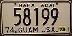 1974–77 | Embossed black on reflective white with border line; "74" at bottom left | Hafa Adai | 12-345 | 1 to approximately 57-500 | |