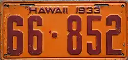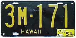 1940 | Embossed black on yellow; "HAWAII 1940" at bottom, offset to right | A/A1234 | County-coded (see right) | Honolulu County used O as the second letter and numbers 5000–9999; Hawaii County used H and numbers 2000–2999; Maui County used M and numbers 3000–3999; and Kauai County used K and numbers 4000–4999. The number allocations were used through 1950.[1] |