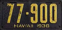 1938 | Embossed yellow on black; "HAWAII 1938" centered at bottom | Issued in blocks by county | ||